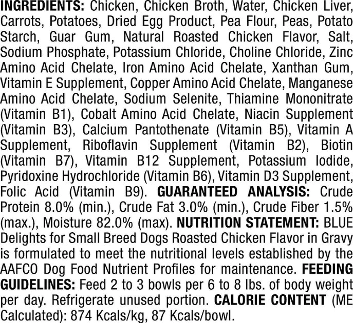 - Blue Buffalo Divine Delights Roasted Chicken Flavor Hearty Gravy Dog Food Trays are specially crafted for small breed canine companions.