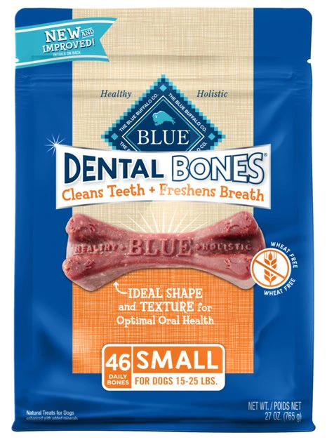 Blue Buffalo Dental Bones All Natural Small Dog Treats are tasty and highly digestible dental chews that help freshen your dog’s breath and make his teeth sparkle. These small bones are great for dogs 15-25 lbs. They’re the only dental chews with a unique blend of natural ingredients that help promote specific health benefits.