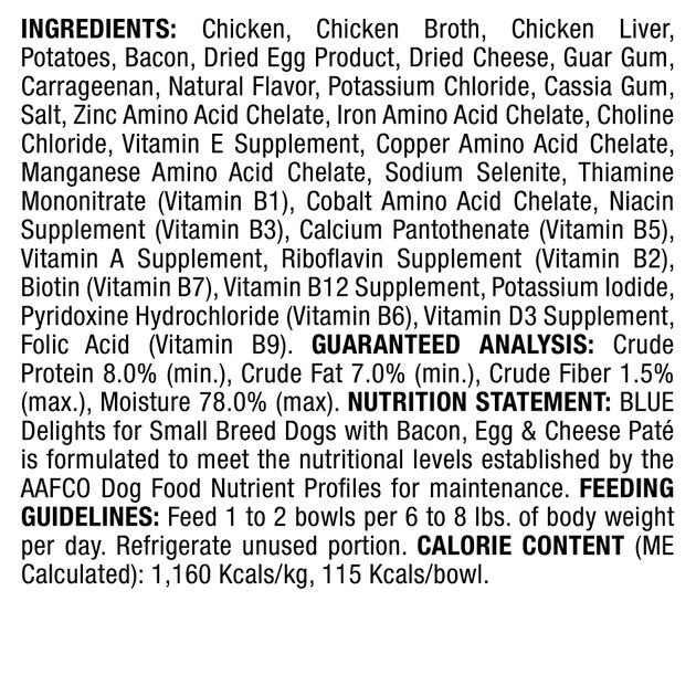 Feed your little furry friend a meal that’s both nutritious and delicious! Blue Buffalo Divine Delights Bacon, Egg & Cheese Pate is crafted to meet the nutritional requirements of small breed dogs. Featuring high-quality, natural ingredients like real chicken first, along with bacon, egg and cheese, each wag-worthy tray is packed with the flavor your pup craves. And with zero grains and added vitamins and minerals to support your hound’s overall health, how can you go wrong? You can’t!