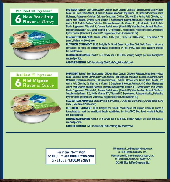 - Every pack comes with 6 cups of New York Strip Flavor in Gravy and 6 cups of Filet Mignon Flavor in Gravy. Both recipes are crafted with real beef first to help fuel your little furry friend’s muscles and support his higher energy needs.