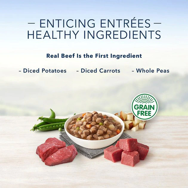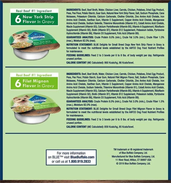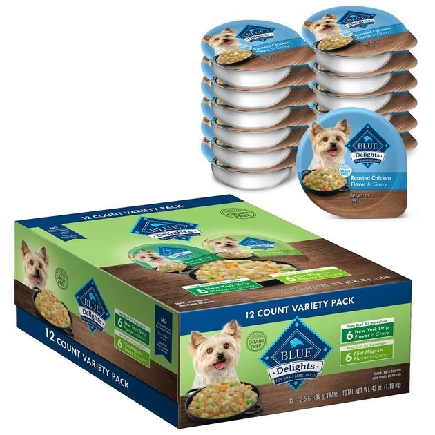 Feed your little furry friend a meal that’s both nutritious and delicious! Blue Buffalo Divine Delights Gravy Variety Pack Filet Mignon & NY Strip Flavor + Roasted Chicken Flavor Hearty Gravy Dog Food Trays are crafted to meet the nutritional requirements of small breed dogs. Featuring high-quality, natural ingredients like real beef or chicken first, along with potatoes, carrots and peas in a delectable gravy, each wag-worthy tray is packed with the flavor he craves. And with zero grains and added vitamins and minerals to support your hound’s overall health, how can you go wrong? You can’t!