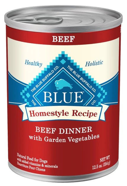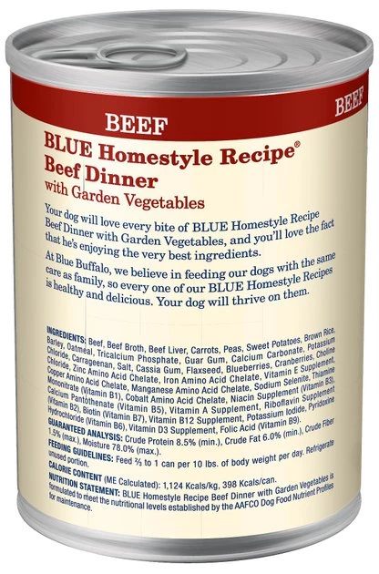 Serve your best buddy the flavorful beef he needs with Blue Buffalo Homestyle Recipe Natural Adult Wet Dog Food. Paw-fect for your doggie dude, this irresistibly tasty wet food is made using only the finest natural ingredients. It starts with high-quality protein from tender chunks of beef, packed with garden fruits and veggies, then enhanced with vitamins and minerals. Formulated to support lean muscle mass and the other nutritional needs of your adult amigo, this pate-style dog food is made with wholesome ingredients that do not contain any by-product meals, corn, wheat, soy, artificial flavors or preservatives.