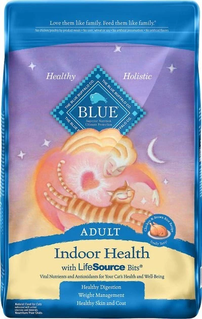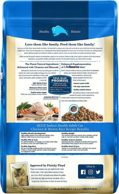 - Blue Buffalo Indoor Health Chicken & Brown Rice Recipe Adult Dry Cat Food is made with LifeSource Bits—a blend of antioxidants, minerals and vitamins chosen by vets and animal nutritionists to support your pet’s immune health, life stage requirements and a healthy oxidative balance.