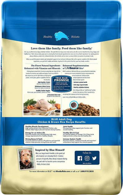 - Blue Buffalo Life Protection Formula Adult Chicken & Brown Rice Recipe Dry Dog Food features essential, high-quality protein for healthy muscle development, and carbs for energy for an active life.