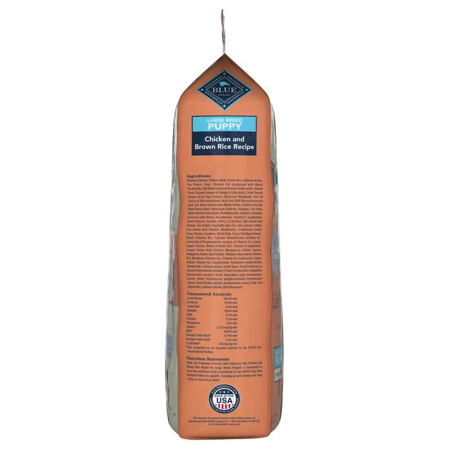Blue Buffalo Life Protection Formula was created for the health and well-being of dogs. All formulas start with real meat, whole grains, garden veggies and fruit, plus added LifeSource Bits, a precise blend of nutrients that have been enhanced with a Super 7 package of antioxidant-rich ingredients. This Large Breed Puppy Chicken & Brown Rice Recipe features delicious, protein-rich deboned chicken. And because puppyhood is such an important stage, it features ingredients that support healthy growth and development.