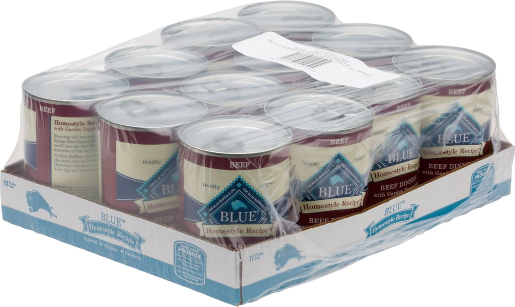 - Blue Buffalo Homestyle Recipe Beef Dinner with Garden Vegetables & Sweet Potatoes Canned Dog Food, 12.5-oz, case of 12—Starts with real beef to keep your buddy feeling active and energetic.