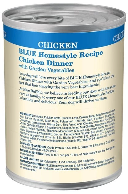 - Blue Buffalo Homestyle Recipe Chicken Dinner with Garden Vegetables & Brown Rice Canned Dog Food, 12.5-oz, case of 12—Paw-fectly nutritious food for adult dogs.
