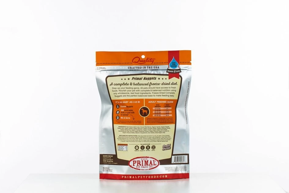 - Primal Beef Formula Nuggets Grain-Free Raw Freeze-Dried Dog Food, 5.5-oz bag—Incorporates certified organic produce, certified organic minerals and unrefined vitamins to fortify the complete and balanced nutrition for all life stages.