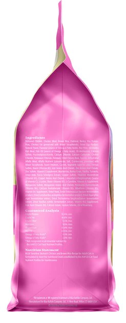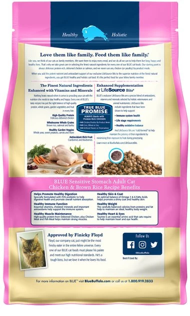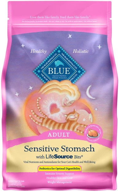 Give your kitty some kibble that’s nutritious and oh-so-delicious! Blue Buffalo’s Sensitive Stomach Chicken Recipe Adult Dry Cat Food is made from some of the finest natural ingredients and enhanced with vitamins and minerals. This delectable recipe is designed for sensitive bellies and features FOS prebiotics for healthy digestion, real chicken first to fuel your cat’s muscles, plus wholesome grains, veggies and fruit. It also includes BLUE’s exclusive LifeSource Bits—a combination of selected antioxidants, minerals and vitamins picked by veterinarians and animal nutritionists to support your cat’s overall health and wellness. Now your paw-tner really has something to purr about!