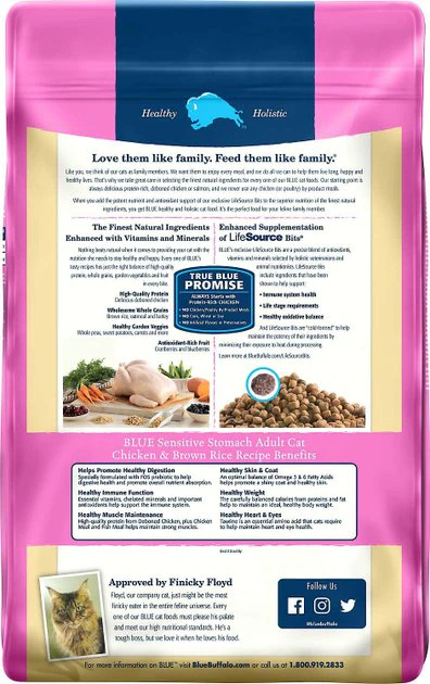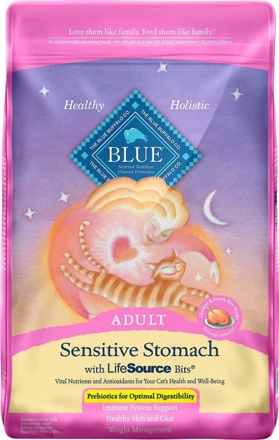 - Blue Buffalo Sensitive Stomach Chicken Recipe Adult Dry Cat Food is made with LifeSource Bits—a blend of antioxidants, minerals and vitamins chosen by vets and animal nutritionists to support your pet’s immune health, life stage requirements and a healthy oxidative balance.