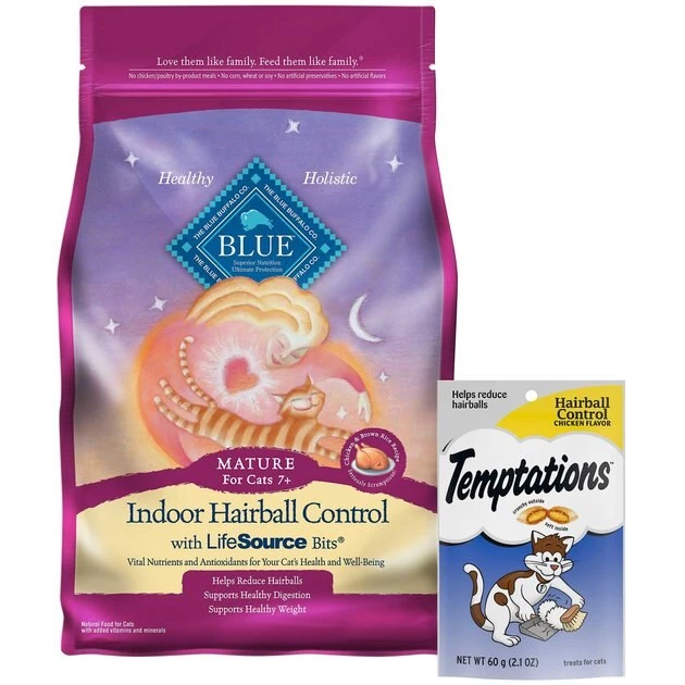 Does your kitty cough up unsightly hairballs? Then get her this Blue Buffalo Indoor Chicken & Brown Rice Recipe Dry Food + Temptations Hairball Control Chicken Flavor Cat Treats bundle! Blue Buffalo’s Indoor Hairball Control Chicken & Brown Rice Recipe is made for mature indoor felines with some of the finest natural ingredients like real chicken first, wholesome grains, vegetables and fruits. It contains natural sources of fiber like cellulose and psyllium seed husks to help minimize hairballs, plus taurine to support eye and heart health. It also includes BLUE’s exclusive LifeSource Bits—a combination of selected antioxidants, minerals and vitamins picked by veterinarians and animal nutritionists to support your cat’s overall health and wellness. When mealtime is over, reward her with Temptations Hairball Control cat treats! These paw-pular cat treats are formulated to help prevent hairballs. They are crunchy on the outside and soft on the inside. With their scrumptious chicken flavor, they will keep your cat wanting more!