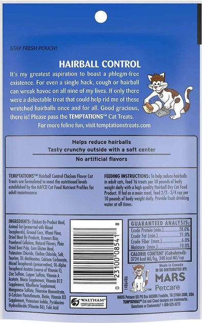 - The cat treats are specially formulated to eliminate and help prevent hairballs and are 100% nutritionally complete and balanced for adult cat maintenance.
