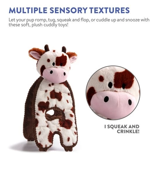 Your dog will be in the moo’d to play tug-of-war with the Charming Pets Cuddle Tugs Cow Squeaky Plush Toy! This extendable toy cow is designed to open up for an exciting game of tug. Squeakers and crinkle paper in the body and head add some extra fun while your pal romps and plays. It’s super-durable, made with K9 TUFF Guard material, double-stitched seams and non-rip canvas, so your pup can enjoy his new toy for longer. And since it’s also plush and soft, it’s perfect for cuddling up with when playtime is done!
