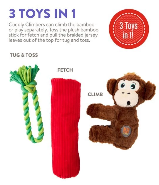 Playtime is becoming even more fun with the addition of a new triple threat on the scene—in this case, it’s the Charming PetCuddly Climbers Monkey Plush Dog Toy! This 3-in-1 toy has a handy bamboo stick the cuddly buddy clings to and slides around on, while you can detach it for a rowdy game of fetch or pull out the braided jersey leaves for some quality tug-o-war. Plus, Charming Pet’s K9 Tuff Guard technology ensures that a few chews won’t tear it apart due to durable, non-rip canvas, double-stitched seams, and nylon-infused tear points. The added squeaker and crinkle will drive your pup paw-sitively mad for playtime.