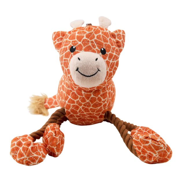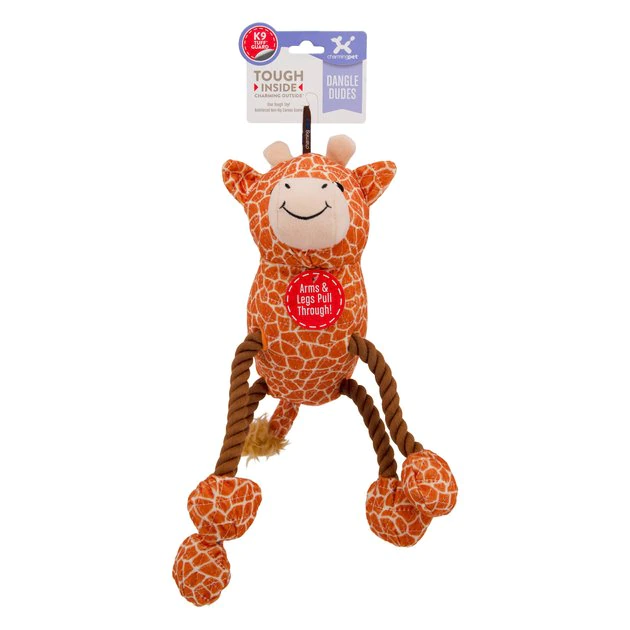 Take your sidekick on a safari with the Charming Pet Dangle Dudes Giraffe Plush Dog Toy. This plush tug toy for dogs is designed for durability and long-lasting playtime. It is crafted with quilted, double-stitched patterns on the outside that prevent ripping and a denier canvas lining, nylon backing and dense polyfill on the inside—so you and your furry friend can enjoy some epic tug-of-woof games. This dog tug toy includes five fun internal squeakers as well as unique, pull-through limbs for an added element of surprise for your canine companion.
