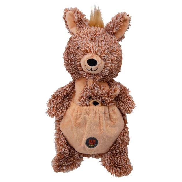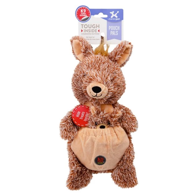 Watch your bestie bounce all around with his new Charming Pet Pouch Pals Kangaroo Squeaky Dog Toy. This hide and seek toy for dogs is the paw-fect way to encourage activity in your pet pal. It features an adorable mama and baby plush toy set complete with a hidden flap in the baby plush to stash snacks and goodies for your furry friend to find. This two-in-one dog toy is designed for durability with a denier canvas lining, double-stitched seams and a nylon-fused backing. It includes a fun internal noisemaker that grunts when your good boy presses on its belly.