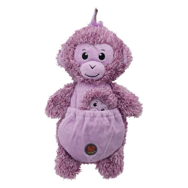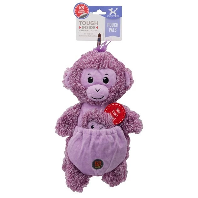 Your fuzzy buddy will go bananas over his new Charming Pet Pouch Pals Monkey Squeaky Dog Toy. This hide and seek toy for dogs is the paw-fect way to encourage activity in your pet pal. It features an adorable mama and baby plush toy set complete with a hidden flap in the baby plush to stash snacks and goodies for your furry friend to find. This two-in-one dog toy is designed for durability with a denier canvas lining, double-stitched seams and a nylon-fused backing. It includes a fun internal noisemaker that grunts when your good boy presses on its belly.