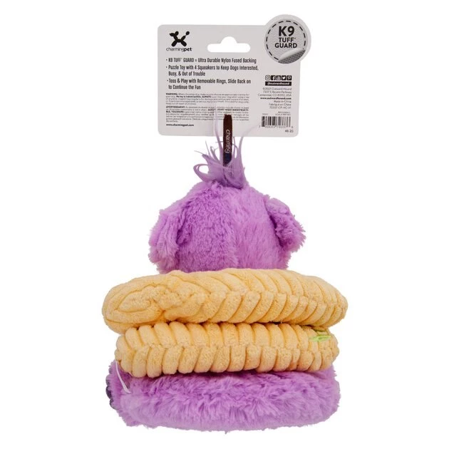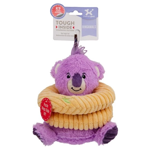 Add a new element of adventure to playtime with the Charming Pet Ringamals Koala Squeaky Puzzle Dog Toy. This puzzle toy for dogs is the paw-fect way to keep your sidekick feeling stimulated. It features fun, squeaky and crinkly rings that your buddy can bite, paw and nudge off of his new plush pal. This puzzle dog toy also doubles as a fetch toy when you toss the rings for your canine companion to chase down. It is soft on your good boy’s gums and designed for durability with denier canvas, double-stitched seams and a nylon-fused backing.