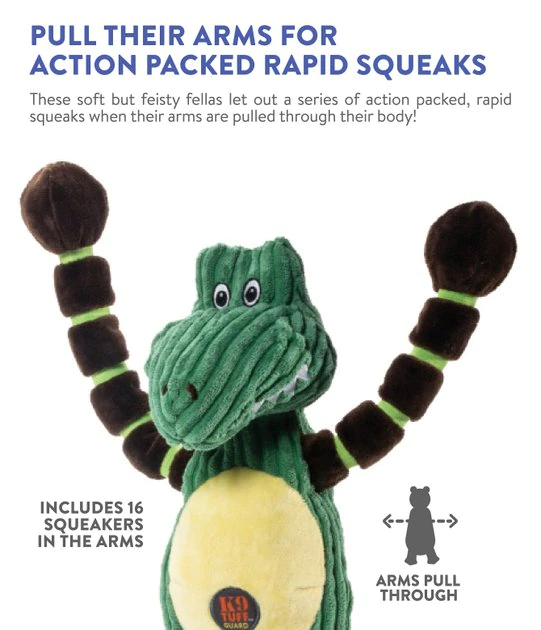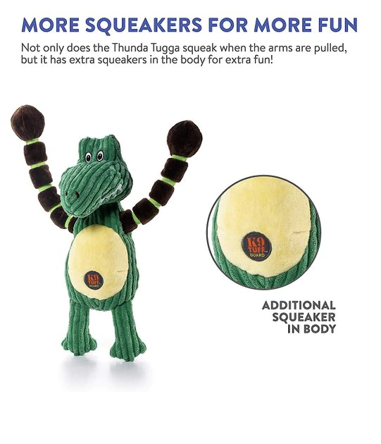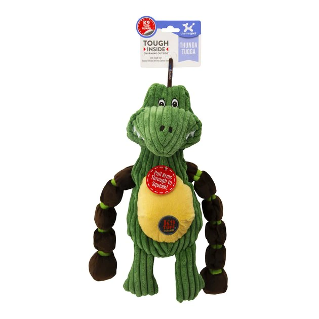 The Charming Pet Thunda Tugga Gator Squeaky Plush Dog Toy is every toy-tuggin’ dog’s dream come true! This interactive toy is perfect for tugging and lets out a series of dog-delighting squeaks when your pup pulls the gator’s arms. There are additional squeakers in the body for extra silly, squeaky excitement. Made with corduroy fabric and featuring K9 TUFF Guard material, this paw-some toy is also built to be durable and long-lasting. Let the tug-of-war fun begin!