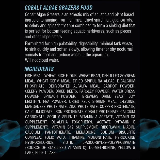 Give your scaly sidekicks the nutrition they need with the variety they love by dropping Cobalt Aquatics’ Algae Grazers Fish Food in their tank. These sinking pellets are proudly made in the USA with a wholesome aquatic and plant-based ingredients like fish meal, spirulina algae, celery, spinach and carrots! Specially crafted for bottom feeding aquatic herbivores like plecos and other algae eaters, this fish food is designed to sink fast and soften slowly, giving your finned friends plenty of time to enjoy their meal. Cobalt Aquatics’ Algae Grazers Fish Food is palatable, digestible, creates minimal tank waste and won’t cloud water!