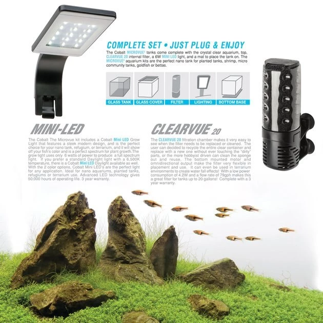 Get a head start on your fishy friend’s new habitat with the Cobalt Aquatics Microvue 30 Aquarium Kit. This starter kit includes a crystal clear glass tank made with clear silicone sealant for an uninterrupted view of your fish. It also comes with a Clearvue 20 internal filter to help keep aquarium water clean and clear. Finish your setup with the included glass top and foam under-pad, then show off your new tank using the 6-watt LED light. You’ll want to put your fish and his snazzy new home in the spotlight!