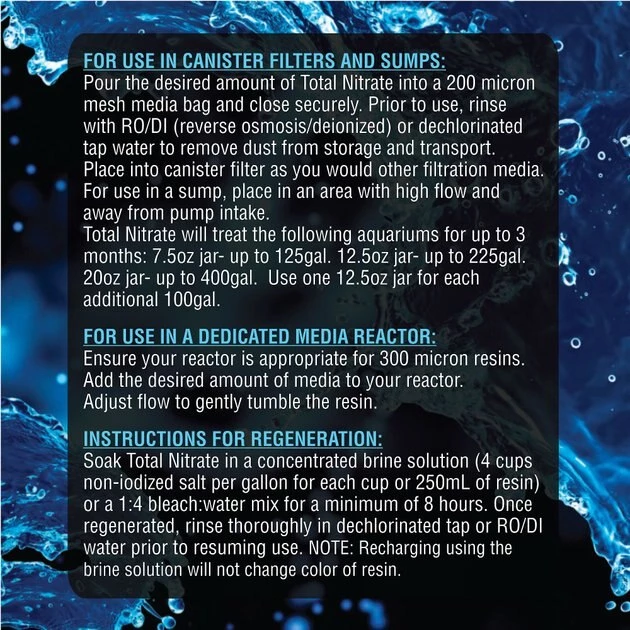 Cobalt Aquatics Total Nitrate, Phosphate & Metal Removing Resin helps you take expert care of your scaly sidekicks water world. This ion-exchanging, highly durable resin removes nitrite, nitrate, phosphate and metals in freshwater and saltwater aquariums. When exhausted, it will not release the collected pollutants back into the water. Plus, thanks to its ability to regenerate, you can use Cobalt Aquatics Total Nitrate, Phosphate & Metal Removing Resin time and time again.