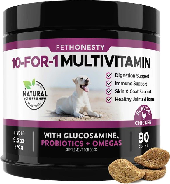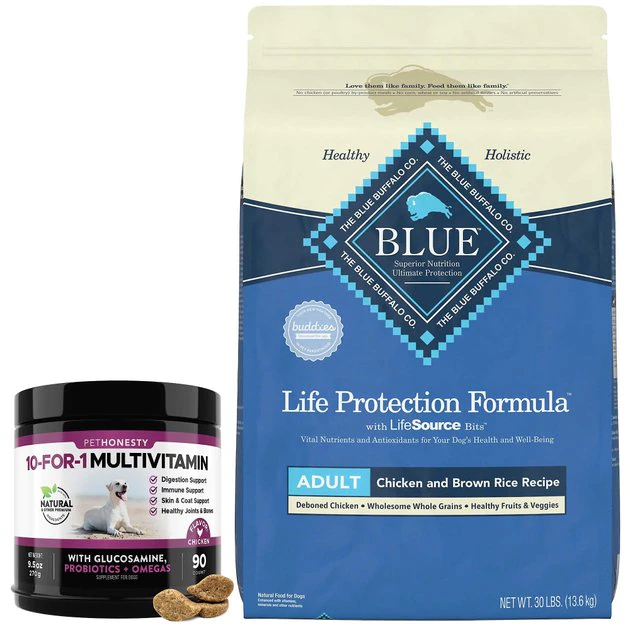 Help support your furry friend’s overall daily health with PetHonesty 10-for-1 Chicken Flavored Soft Chews Multivitamin for Dogs + Blue Buffalo Life Protection Formula Adult Chicken & Brown Rice Recipe Dry Food. These vet-recommended chews are made with a wag-worthy natural chicken flavor and a combination of glucosamine, vitamin C, omegas, vitamin A and other essential vitamins and minerals. These ingredients work together to support hip and joint health, heart health, and skin and coat health. They also help promote energy and offer your pup the antioxidants and probiotics he needs for normal and healthy digestion. Meanwhile, Life Protection features delicious, protein-rich deboned chicken and nutrients to support the overall health and well-being of your senior dog. All Blue Buffalo formulas start with real meat, whole grains, garden veggies and fruit, plus added LifeSource Bits, a precise blend of nutrients that have been enhanced with a Super 7 package of antioxidant-rich ingredients.