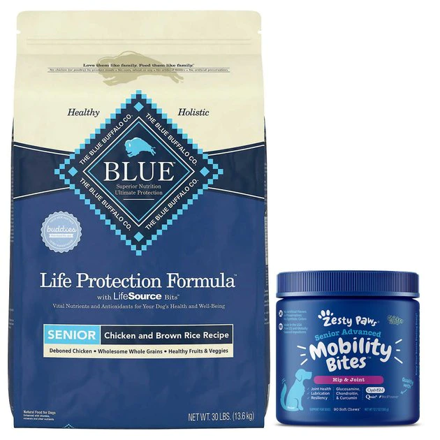 Keep your senior sweetie jumping for joy with Zesty Paws Advanced Mobility Chicken Flavored Chews Joint Supplement + Blue Buffalo Life Protection Formula Chicken & Brown Rice Recipe Dry Food for Senior Dogs. This Zesty Paws supplement features OptiMSM, a form of MSM that provides premium muscular support, plus Qmin+ (Curcumin) to provide premium support for hips and joints and BioPerine (black pepper extract) to support the Curcumin’s absorption. These ingredients, along with glucosamine HCl, chondroitin sulfate, green lipped mussel, vitamin C, vitamin E, and hyaluronic acid, support hips, joints, connective tissue and cartilage for dogs. Meanwhile, Life Protection features delicious, protein-rich deboned chicken and nutrients to support the overall health and well-being of your senior dog. All Blue Buffalo formulas start with real meat, whole grains, garden veggies and fruit, plus added LifeSource Bits, a precise blend of nutrients that have been enhanced with a Super 7 package of antioxidant-rich ingredients.